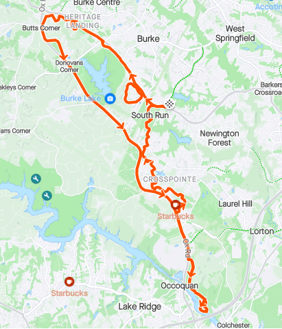 STRAVANice steady loop with a drop to the Occoquan and a climb back out. Almost all bike paths except for a few segments through some neighborhoods.