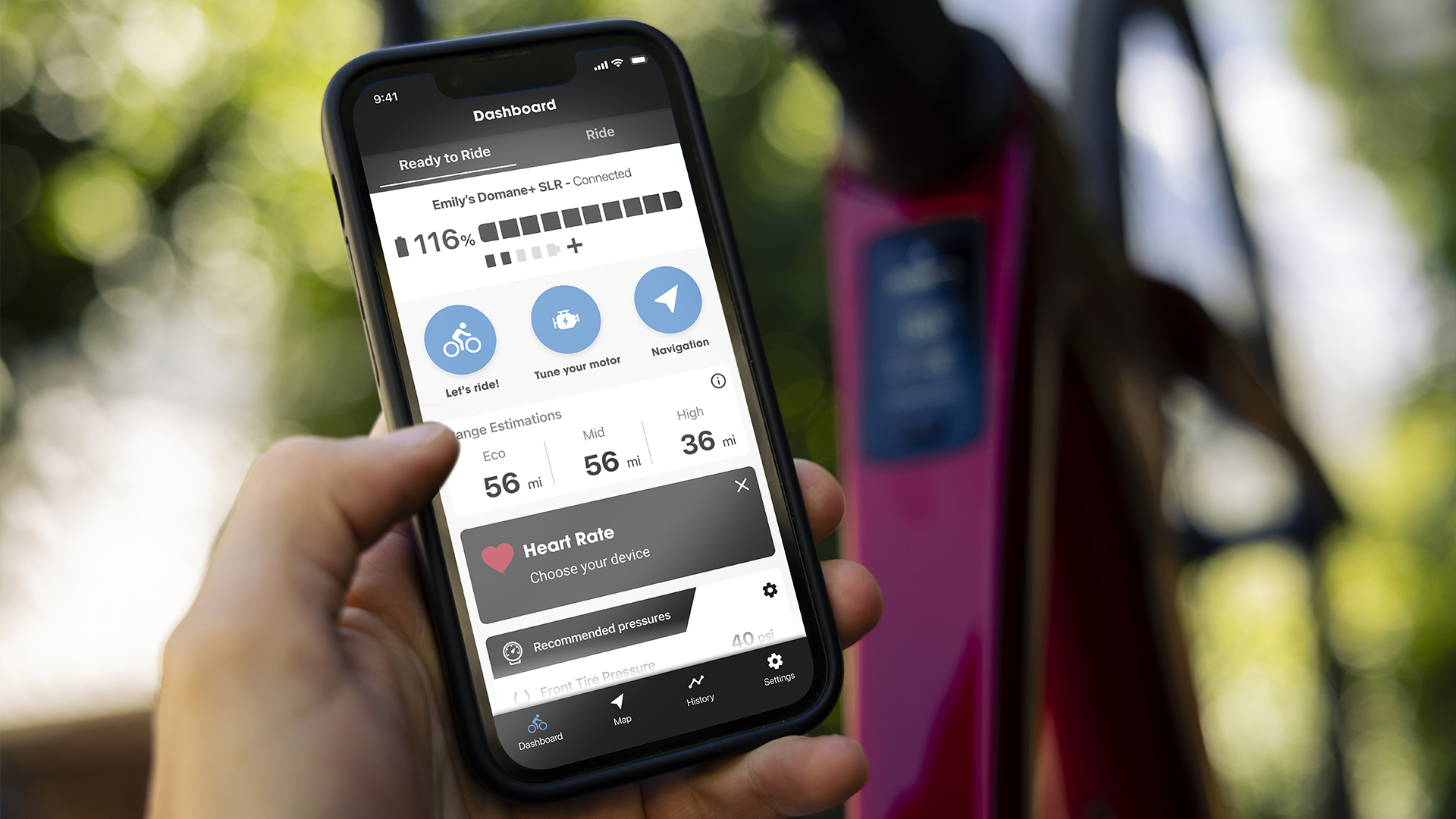 The Trek Central app seamlessly connects to your Domane+ for real-time range calculations, activity tracking, and custom motor tuning. Plus, navigation and mapping features help you stay on course wherever you ride.